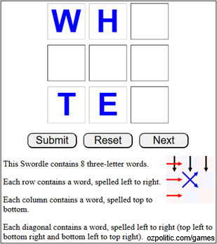 Each Swordle puzzle is a square grid "no blanks" crossword puzzle, with each row and each column forming a word. For some puzzles, the diagonals or smaller sub-squares also form words.