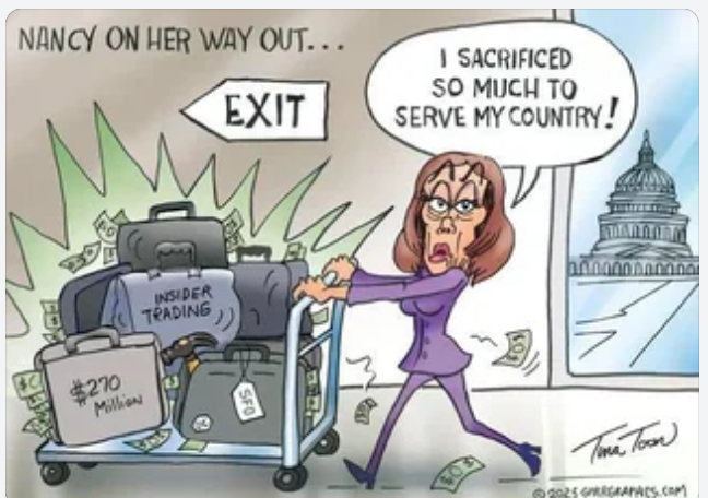 No Memecoin sales, Arabian property deals, free jumbo jets or family members selling arms to the Muselman. Nancy should get herself a comfy retirement, ja? No messy impeachment trials when the House changes in 2027. DRAIN THE SWAMP !!! |