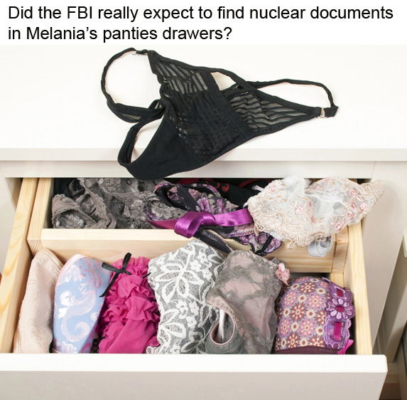 If only Melania had used a decent fungicide. The reason her husband borrowed her panty drawers is no one ever goes near them. The FBI agents must have been reeling. You can't unsmell that stench, it's disabling. In hindsight, there's probably no safer space to stash the nuclear codes. Even Mar a Lago's notorious Chinese spies stay away. I'd suggest there's still a few left in there. Agents would have called the job in after opening the first drawer. Of course, if DL ever feels like nuking somebody, he'll have to send someone in to retrieve the codes. The question is, who does he hate the most? JD, you're on panty duty. Go gettem. BUTTHURT !!! |