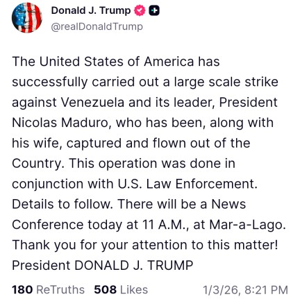 Title: Re: BREAKING: Nicolás Maduro arrested by the U.S. Post by Gordon on Jan 4th, 2026 at 12:53pm |