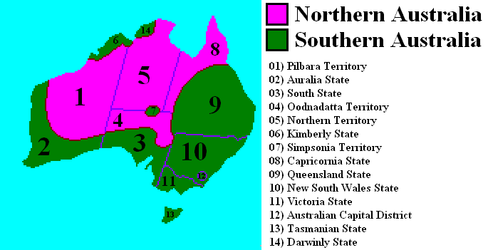 My general idea is to establish two super-states. One which will encompass the region of Australia dominated by the English language and the other dominated by the aboriginal languages. The super-states do not divide up the country, yet rather unite various regions base on their own affiliation and distinction. Most of what you see is the establishing more territories and two or more states. Most of the territories are grouped together to establish the Northern Australian Super-State.