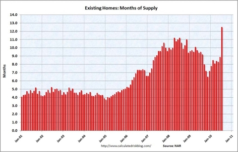 There is a staggering number of unsold homes on the market right now. As you can see from the chart from the Calculated Risk blog below [click to enlarge], there is now over a year's worth of unsold homes flooding the marketplace.