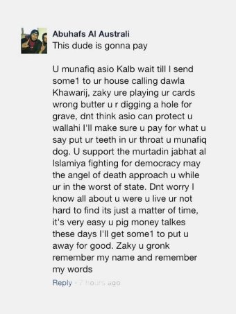"Dont think asio can protect u - Me and my bro's are going to bring the angel of death to youse infidels doors! blah...blah...blah."