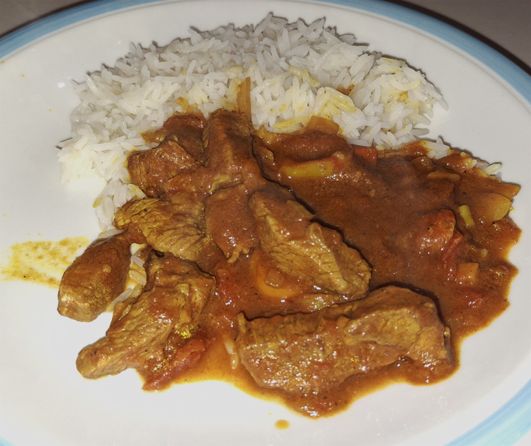 curried lamb with: 3 different colored capsicums, onions and basmati rice.