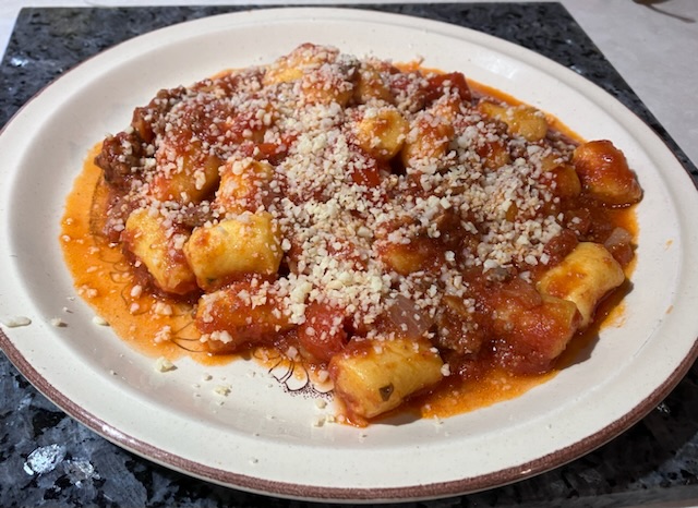 Then I take that out into another bowl, put meat back in and add passata sauce … once it’s cooked, I add gnocci into the sauce.