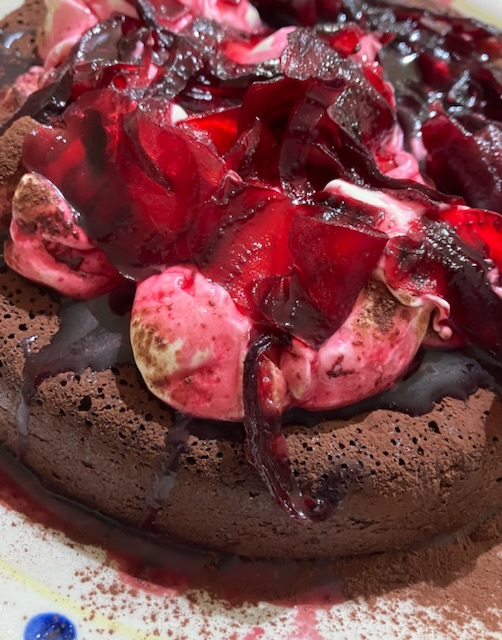 For dessert over the long straya day weekend, I decided to finally make this chocolate beetroot cake, with glazed sweetened beets as topping, cream fraiche, then drizzled with sweetened beet juice over it.