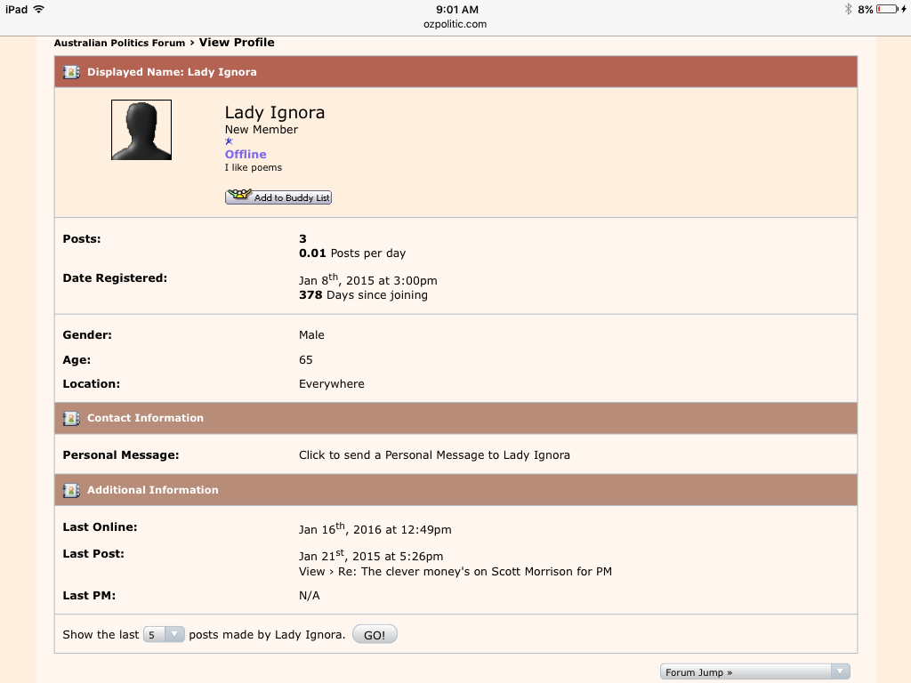 Here we go with the irrelevant crap I knew would arrive. I did not post (or log in) within the 24 hour ban period. Ask Hicks who almost fell for the same mistake you are making. I was golfing for most of the 24 hours, and when I did log in to see the pro forma ban notification, I stayed out until I was able to log in.....after the 24 hours had expired. I made a post on the Saturday (before the ban) and on the next day, Sunday after the ban had expired.