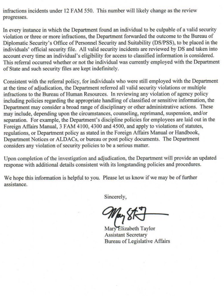 To this point, the Department has assessed culpability to 15 individuals, some of whom were culpable in multiple security incidents. DS has issued 23 violations and 7 infractions incidents under 12 FAM 550.