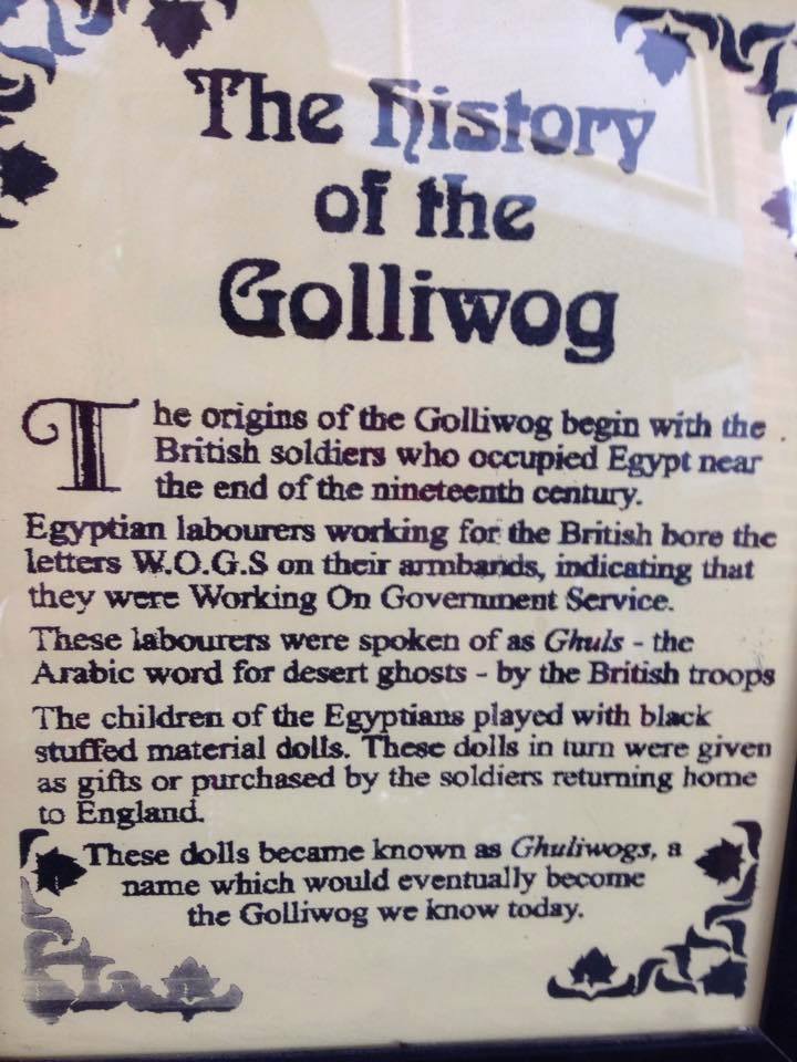 The real history of the Golliwog doll is recounted here.   It makes considerably more interesting reading than JaSin's bullshit explanation in the OT of this thread.   Roll Eyes