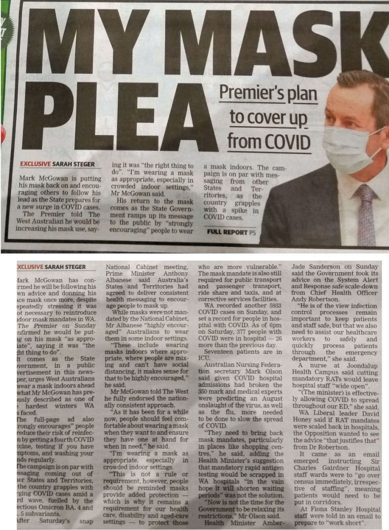 Some of us were wondering where Mark McGowan had disappeared to until we've seen him in the paper today - maybe he caught Covid again on his overseas trip which wouldn't have  been surprising.