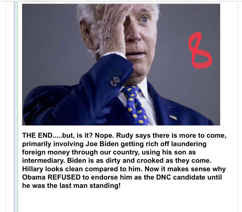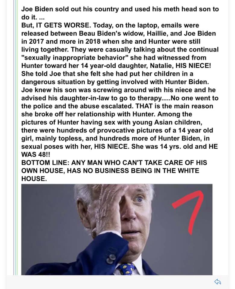 Excellent character assassination through innuendo there Baron....Why didn't you condemn Trump for the same thing regarding his children and his treatment of woman....The problem I have with you bullshit is there is clear evidence of Trump's indiscretions and you only have innuendo to throw at Biden....You are a one eyed dickhead mate!!!