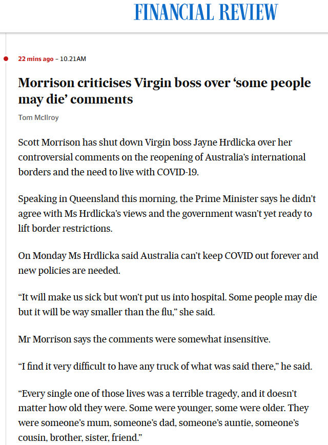 So, aqua... after 5 pages we still haven't found any evidence of these alleged selfish lefties you're talking about but we're starting to see reports coming in of 'righties' (presumably) being rather selfish by wanting Australia's borders fully reopened right now because they want to make more and more money even if people die from Covid as a result.