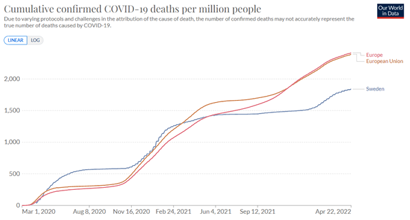 Belgarion wrote on Nov 28 th, 2021 at 8:16pm: Deaths per million citizens. Sweden - 1490. Australia - 77.Yep, the Swedes are crushing it alright....  Not really a fair comparison with Australia. We could see what was happening in Europe we closed our border which is easy to do when you're an Island a long way from everyone. We had more trouble keeping Victorians out of NSW and Qld despite state borders being closed. How did Sweden compare to the UK or Europe data shows they had less deaths per million Quote:What Sweden Got Right About COVID The U.S. botched the pandemic—overprotecting kids at low risk of serious illness and under-protecting older Americans. Stockholm pursued a light touch and fared far better. April 19, 2022 While most countries imposed draconian restrictions, there was an exception: Sweden. Early in the pandemic, Swedish schools and offices closed briefly but then reopened. Restaurants never closed. Businesses stayed open. Kids under 16 went to school. That stood in contrast to the U.S. By April 2020, the CDC and the National Institutes of Health recommended far-reaching lockdowns that threw millions of Americans out of work. A kind of groupthink set in. In print and on social media, colleagues attacked experts who advocated a less draconian approach. Some received obscene emails and death threats. Within the scientific community, opposition to the dominant narrative was castigated and censored, cutting off what should have been vigorous debate and analysis.In this intolerant atmosphere, Sweden’s “light touch,” as it is often referred to by scientists and policy makers, was deemed a disaster. “Sweden Has Become the World’s Cautionary Tale,” carped The New York Times. Reuters reported, “Sweden’s COVID Infections Among Highest in Europe, With ‘No Sign Of Decrease.’” Medical journals published equally damning reports of Sweden’s folly. But Sweden seems to have been right. Countries that took the severe route to stem the virus might want to look at the evidence found in a little-known 2021 report by the Kaiser Family Foundation. The researchers found that among 11 wealthy peer nations, Sweden was the only one with no excess mortality among individuals under 75. None, zero, zip. That’s not to say that Sweden had no deaths from COVID. It did. But it appears to have avoided the collateral damage that lockdowns wreaked in other countries. The Kaiser study wisely looked at excess mortality, rather than the more commonly used metric of COVID deaths. This means that researchers examined mortality rates from all causes of death in the 11 countries before the pandemic and compared those rates to mortality from all causes during the pandemic. If a country averaged 1 million deaths per year before the pandemic but had 1.3 million deaths in 2020, excess mortality would be 30 percent.There are several reasons to use excess mortality rather than COVID deaths to compare countries. The rate of COVID deaths ignores regional and national differences. For example, the desperately poor Central African Republic has a very low rate of fatalities from COVID. But that’s because it has an average life expectancy of 53. People in their 70s are3,000-fold more susceptible than children to dying of COVID, and even people in their 20s to 50s are far less likely to die than the elderly. So, it’s no surprise that the Central African Republic has a low COVID mortality rate despite its poverty and poor medical care. Excess mortality is the smart, objective standard. It includes all deaths, whether from COVID, the indirect effects of COVID (such as people avoiding the hospital during a heart attack), or the side effects of lockdowns. And it gets rid of the problem of underlying differences among countries, allowing a direct comparison of their performance during COVID.