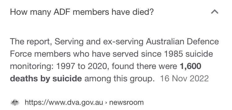 (Lisa Jones...suicides in the ex-ADF is well known (yes also tragic) and there has been a recent if not current Royal Commission on the very issue.)
