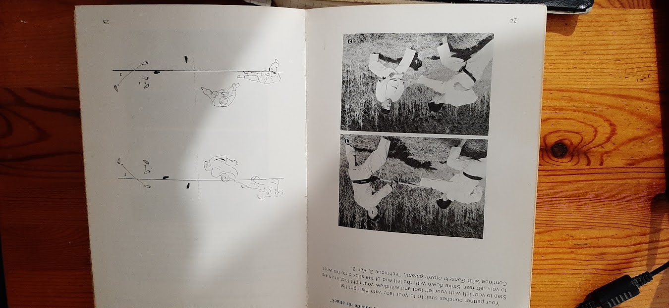 A Renshi 4th Dan gave me a rubber knife in class for a demonstration he threw a front kick at me i stepped back at 45 deg like footwork in picture and slashed right down his leg. He smiled bowed and that was that.