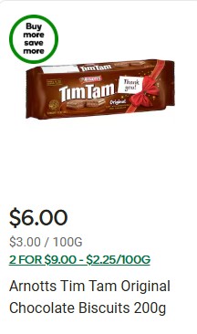 Currently Tim Tam biscuits are on sale for $6 for one pack and two for $9 at more than 1000 Woolworths supermarkets around the country.