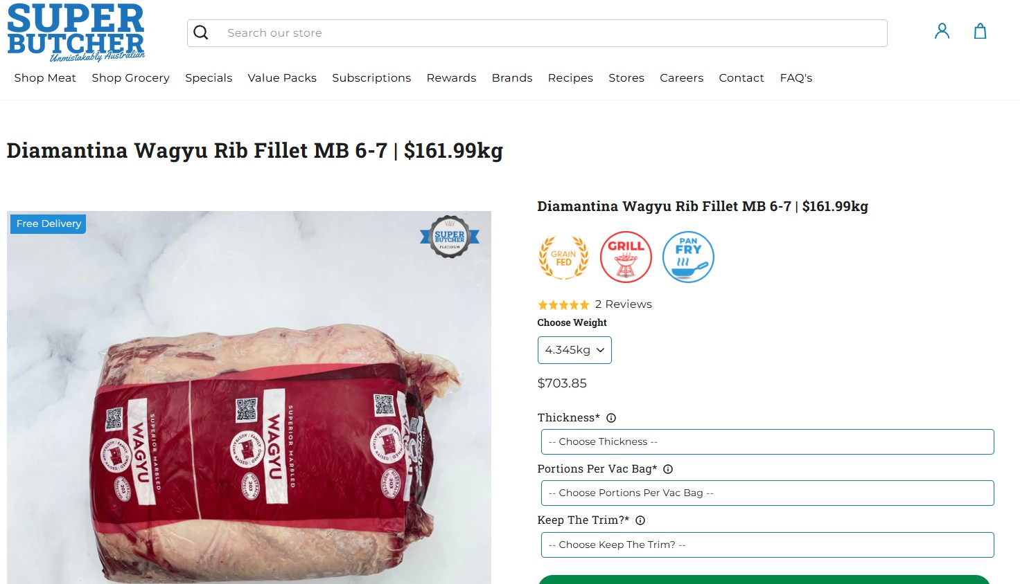 Here's Super Butcher whole Wagyu Rib fillet @ $161.99 per kg.