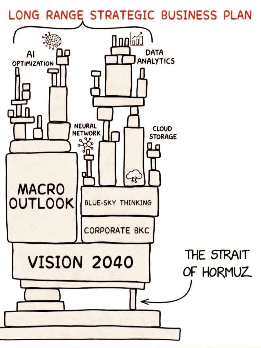 Geez Lee - chill out!    The posting was meant to demonstrate that no matter how high or deep our thinking, decisions made and discarded, bureaus formed and unformed, clouds filled with data etc - at the moment if the little plank of Hormuz goes away - it all turns to custard.     I thought it a very good “cartoon"