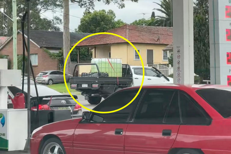 In one clip, a ute is seen pulling out of a petrol station, accused of filling plastic tanks with hundreds of litres of fuel.