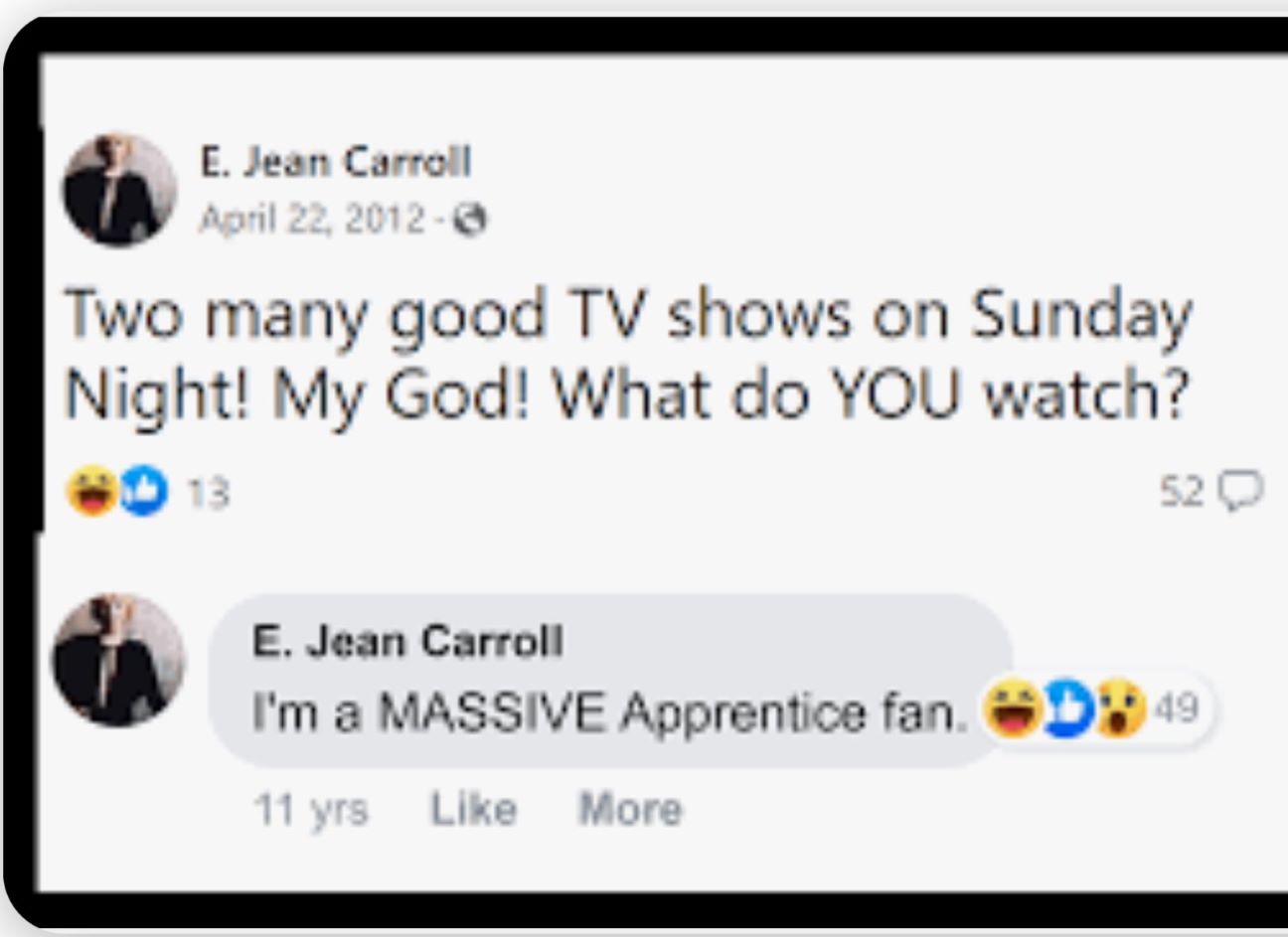 https://www.facebook.com/EJeanCarroll/posts/10151557475215176/ After all that blah blah blah, you still wont address the DNA issue, I wonder why a man who said "I dont know that women,we never met" only to change his claim after pictures of them together proved once again he was lying, would run away from evidence that would prove his innocence.