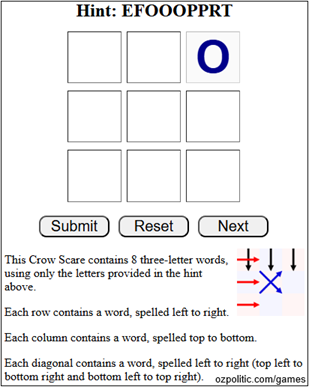 Each Crow Scare puzzle is a square grid "no blanks" crossword puzzle, with each row and each column forming a word. For some puzzles, the diagonals or smaller sub-squares also form words.